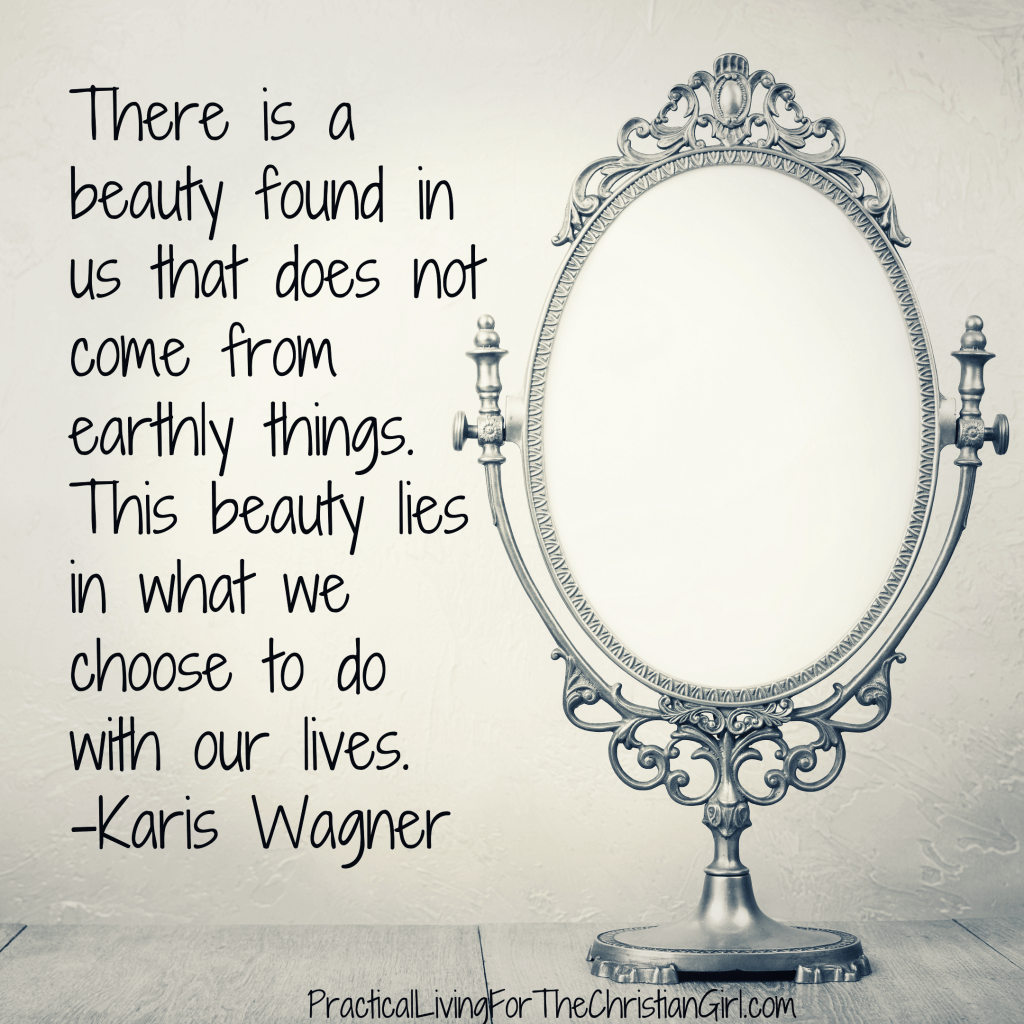 So often, we look at ourselves as if we have no beauty. We define ourselves by what society says, by what the people in the magazine look like, by what the ladies on the TV do with their hair or makeup. We tend to forget—and I myself am guilty of this, so I understand—that there is a beauty found in us that does not come from earthly things. This beauty lies in what we choose to do with our lives. My mother has beautiful hands. I hardly ever see them when they are not actively doing something. My sister has beautiful eyes. She sees when people are hurting and knows just what to do to help.