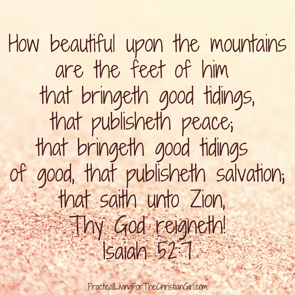 As you go about your day, look for ways to share the gospel. Take the opportunities the Lord provides to serve him. Let your feet be beautiful from carrying the gospel. Let your hands be beautiful from reaching out to others. Let your voice be beautiful from telling people the good news of Christ Jesus.