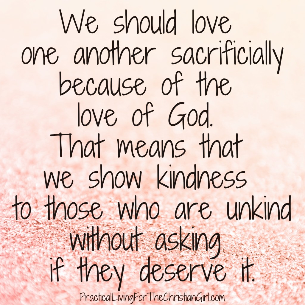 We should love one another sacrificially because of the love of God. That means that we show kindness to those who are unkind without asking if they deserve it. That means showing kindness to those who will never return that favor. We all know someone— or more likely more than one someone— who is a Woe-is-me Debbie Downer constantly criticizing those around them. We’re to be kind even, and especially, to those people in our lives.