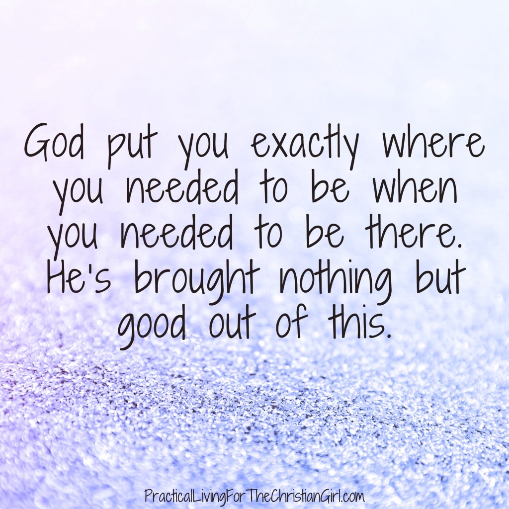 “You were driving a vehicle that wasn’t safe anyway. We probably wouldn’t have been able to sell it. Now you’ve got a sweet insurance payout and a down payment on a safer car. You needed chiropractic care anyway and now it’s covered. You’d already taken the day off work and our plans had changed: we had a day to go shopping with you. God put you exactly where you needed to be when you needed to be there. He’s brought nothing but good out of this.”